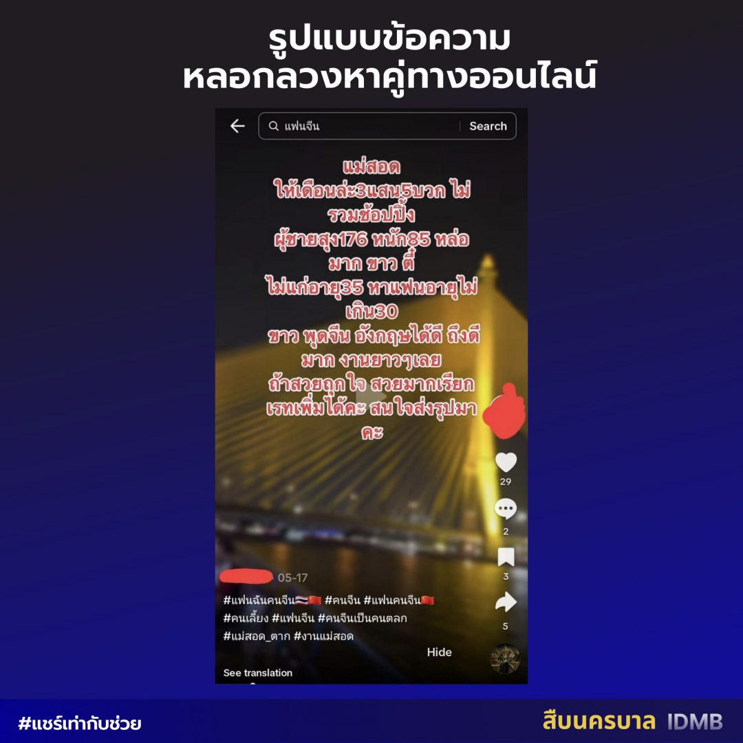 据泰媒报道,目前短视频平台Tiktok越来越受欢迎,很多人喜欢在这些平台上分享生活,比如分享好吃好玩的、找对象、学语言等等,但曼谷京畿警察总署近日发帖提醒,这些可能是骗子们的新骗局,呼吁民众警惕此类消息。同时,还发出中国男性在TikTok上找对象的帖子,如下: