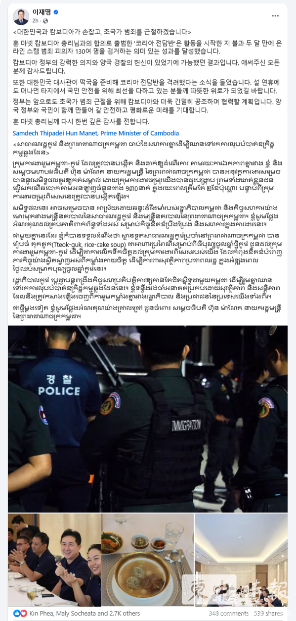(金边讯)韩国总统李在明今日(13日)在社交平台发文,高度肯定柬韩警方打击电诈的协作成效,称两国联合执法行动启动两个月以来,已拘捕涉韩电诈嫌犯逾130人,取得“值得关注的成果”。