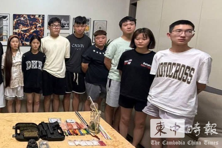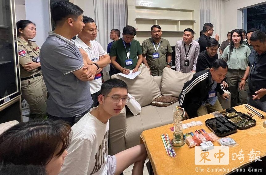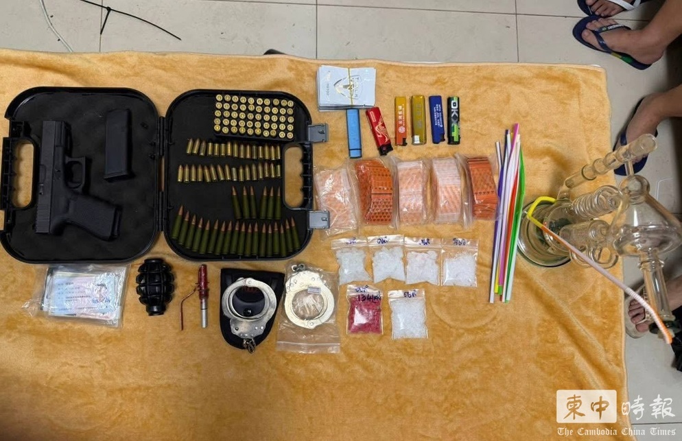 (金边讯)金边市执法人员昨日(21日)在铁桥头区炳发城一带开展外籍人员排查行动时,发现13名中国籍人员同住一处民宅,并在屋内查获枪支、弹药、手铐及大量毒品,当场将所有人员扣留调查。