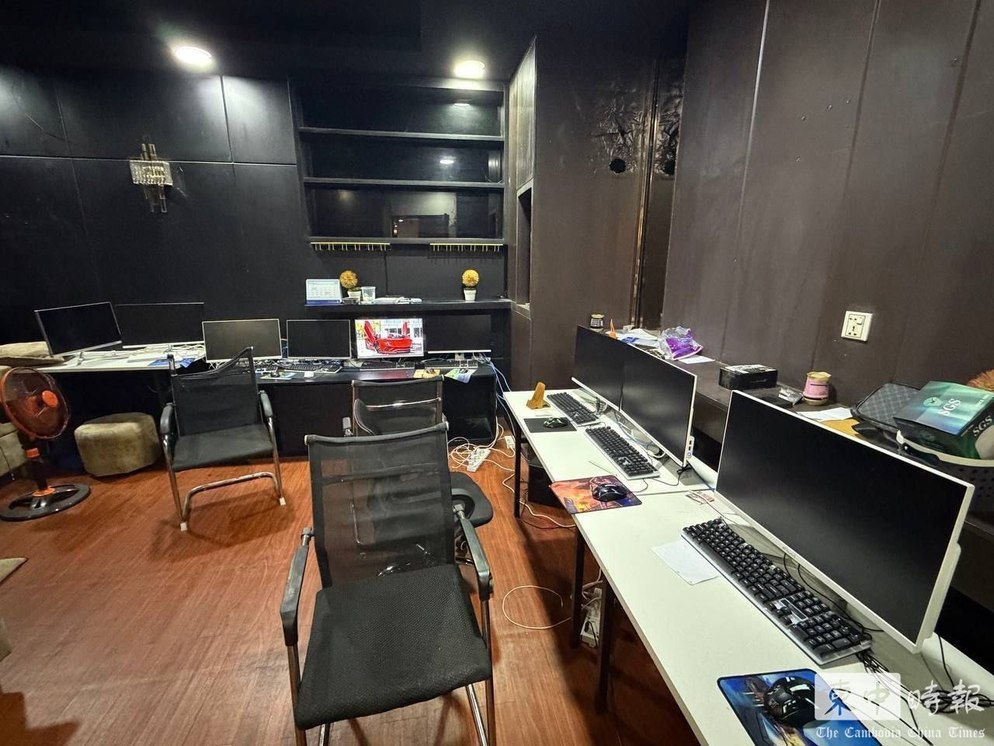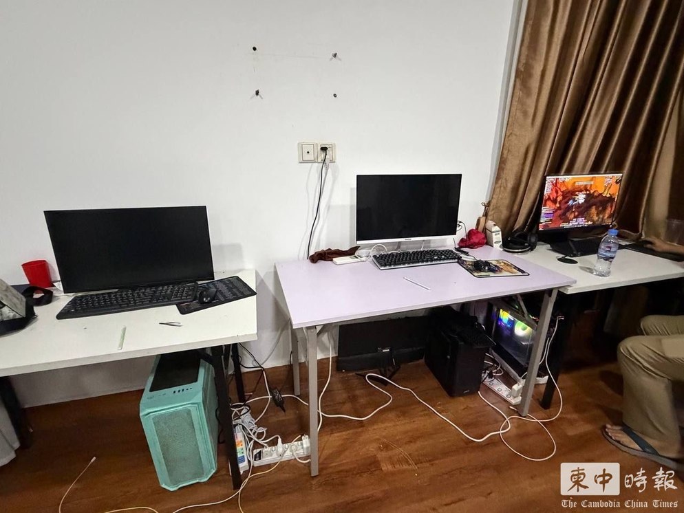 金边铁桥头区一处住宅内,多台电脑设备被用于实施网络诈骗活动。(图:柬中时报)