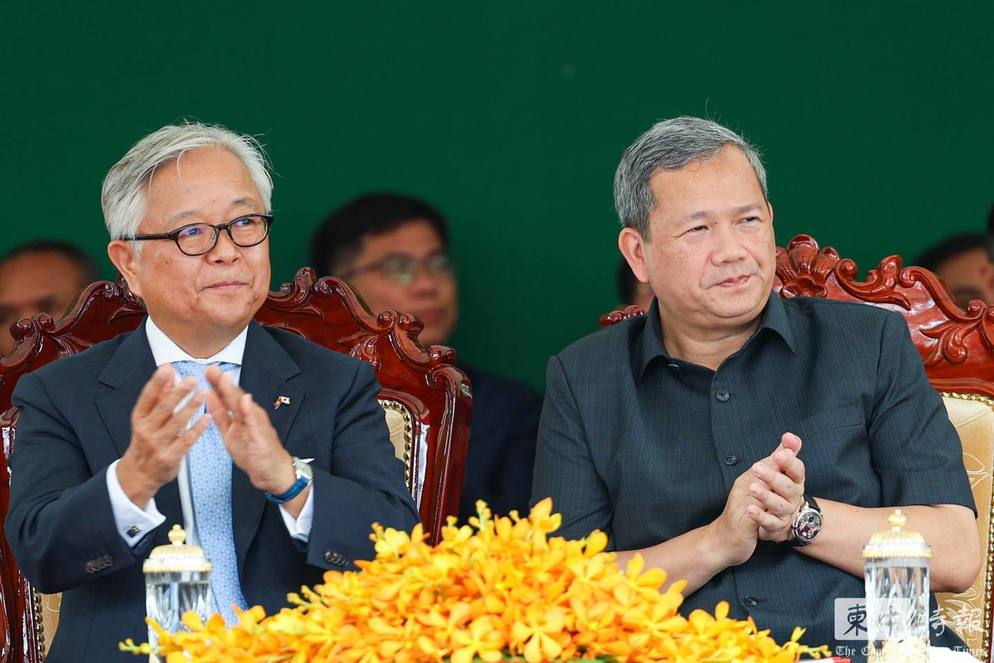 日本驻柬大使植野笃志与洪玛耐总理共同出席柴桢省自来水厂启用仪式。(图:柬中时报)