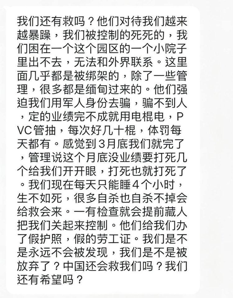 他们强迫我们冒充军人去骗人,骗不到人、完不成业绩,就直接上电棍电,用PVC管抽,一次就是几十下,体罚几乎每天都有。我们现在每天只能睡四个小时,真的生不如死。有人想自杀也死不了,会被救回来继续折磨。