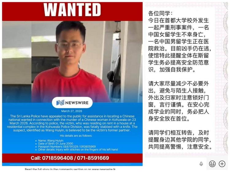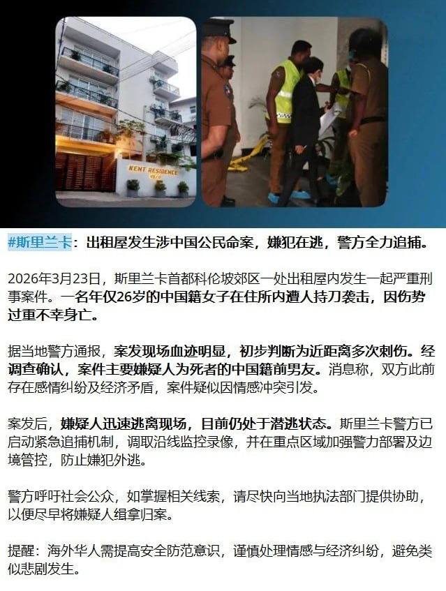 斯里兰卡警方近日向公众发出呼吁,寻求协助抓捕一名涉嫌参与2026年3月23日科胡瓦拉(Kohuwala)谋杀案的中国籍男子。