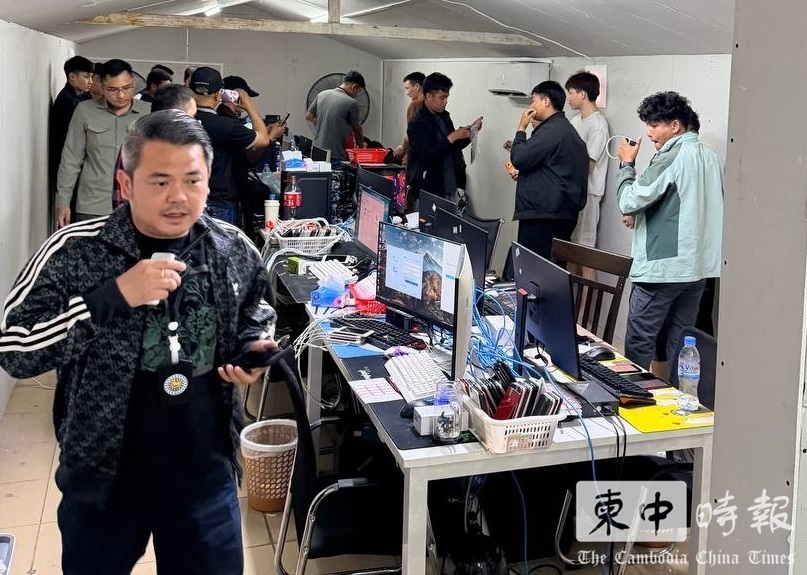 执法人员在现场控制涉案人员,并对设备进行清点取证。(图:柬中时报)