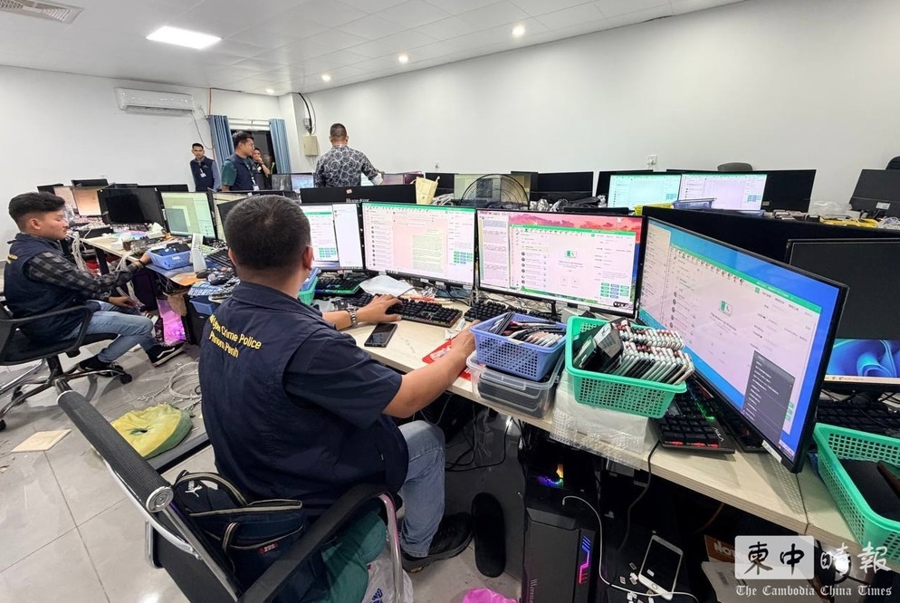 柬埔寨警方近期查处电诈窝点,现场查获大量电脑及手机设备。(图:柬中时报)