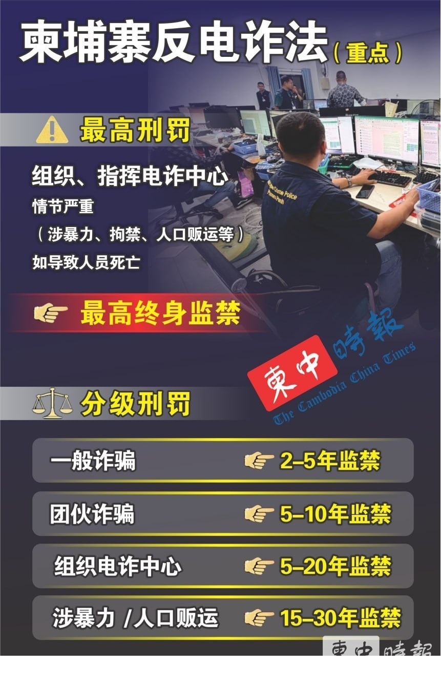 柬埔寨《反电信网络诈骗法》正式生效,组织电诈最高可判终身监禁。(图:柬中时报)