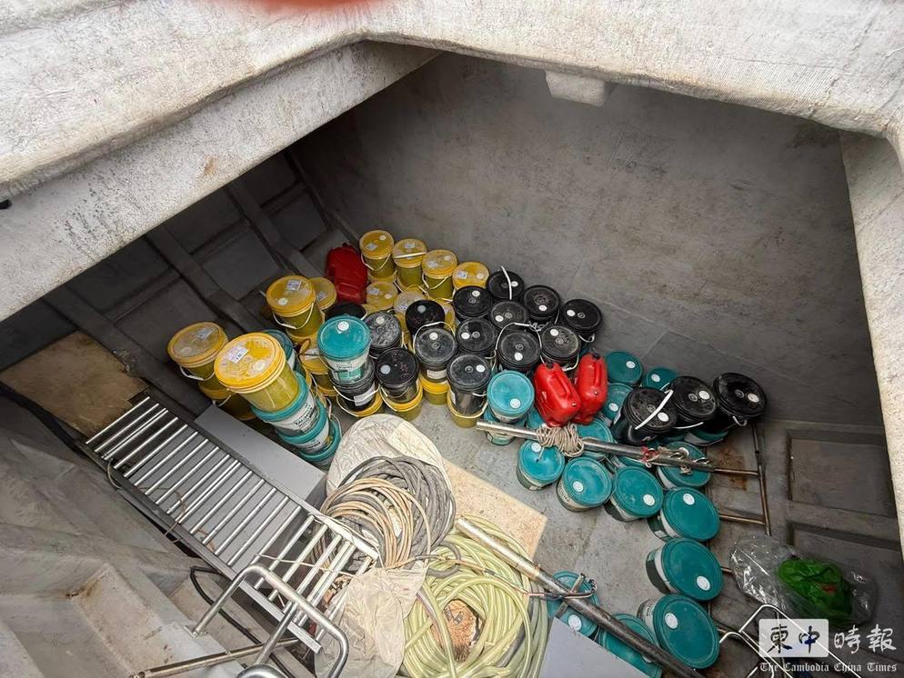 一处舱室同样堆放大量桶装物资及设备。(图:柬中时报)