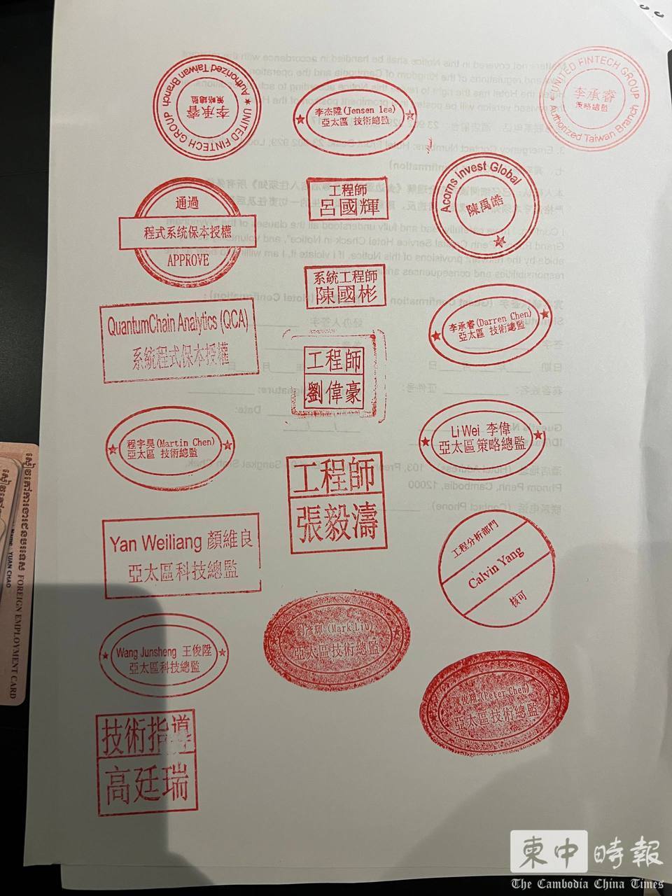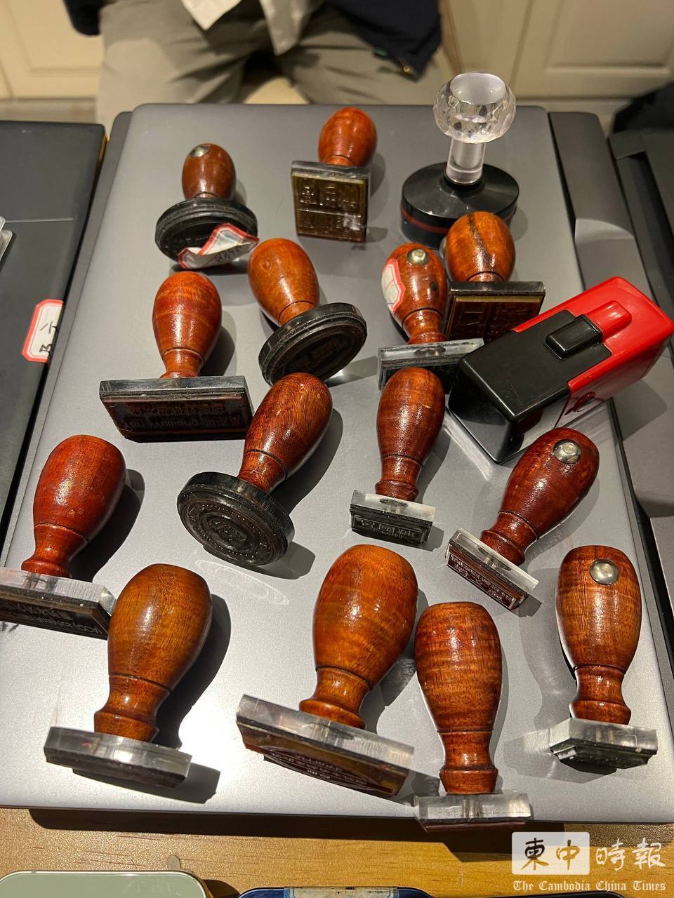 现场查获大量伪造公章及职务印章,疑用于冒充身份实施诈骗。(图:柬中时报)