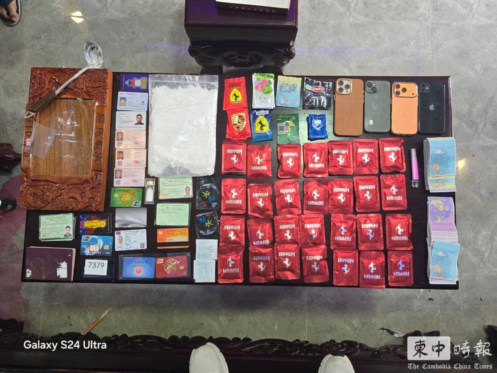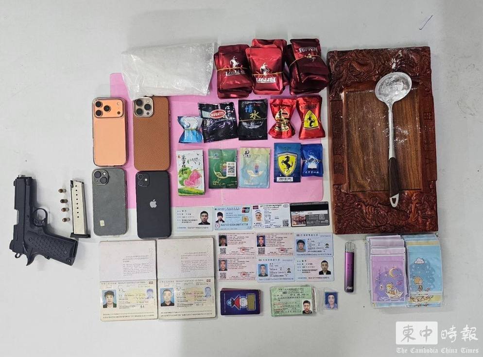 执法人员展示查获的枪支、毒品及证件等物品。(图:柬中时报)