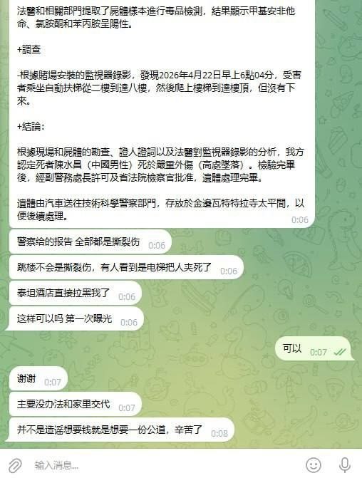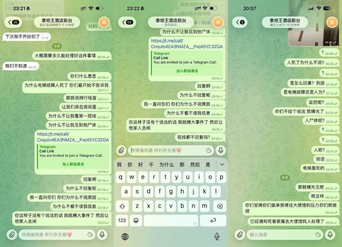 泰坦王现如今电梯还在封锁不能使用,事件已经上报给大使馆要求调查清楚 ,如果泰坦王酒店不给个说法家属马上到来,人命关天你们良心何在?