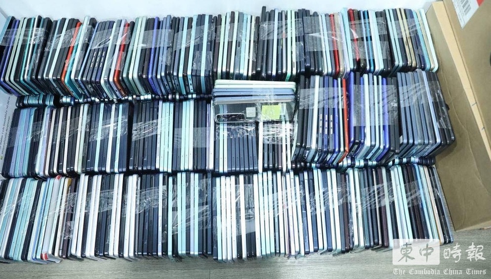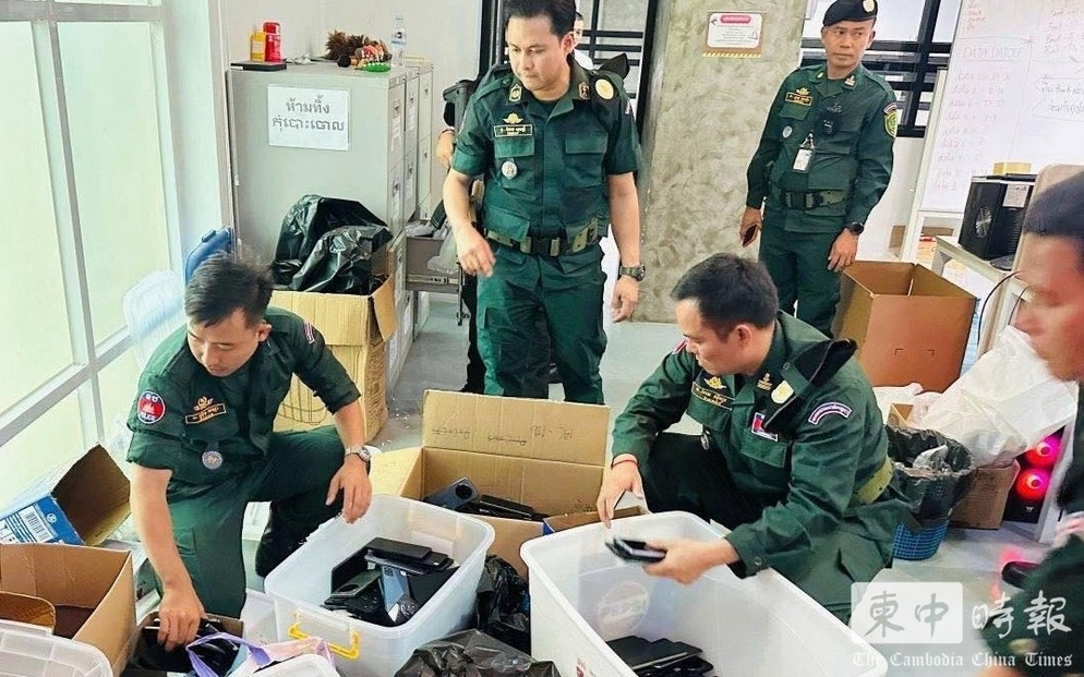 执法人员在现场清点涉案设备,包括手机等作案工具。(图:柬中时报)