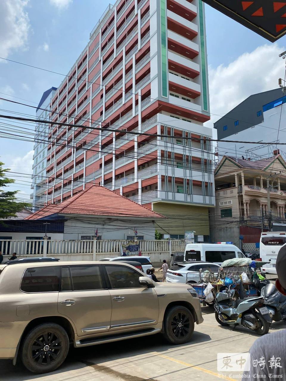 波比市涉案建筑外景,警方车辆在场布控。(图:柬中时报)